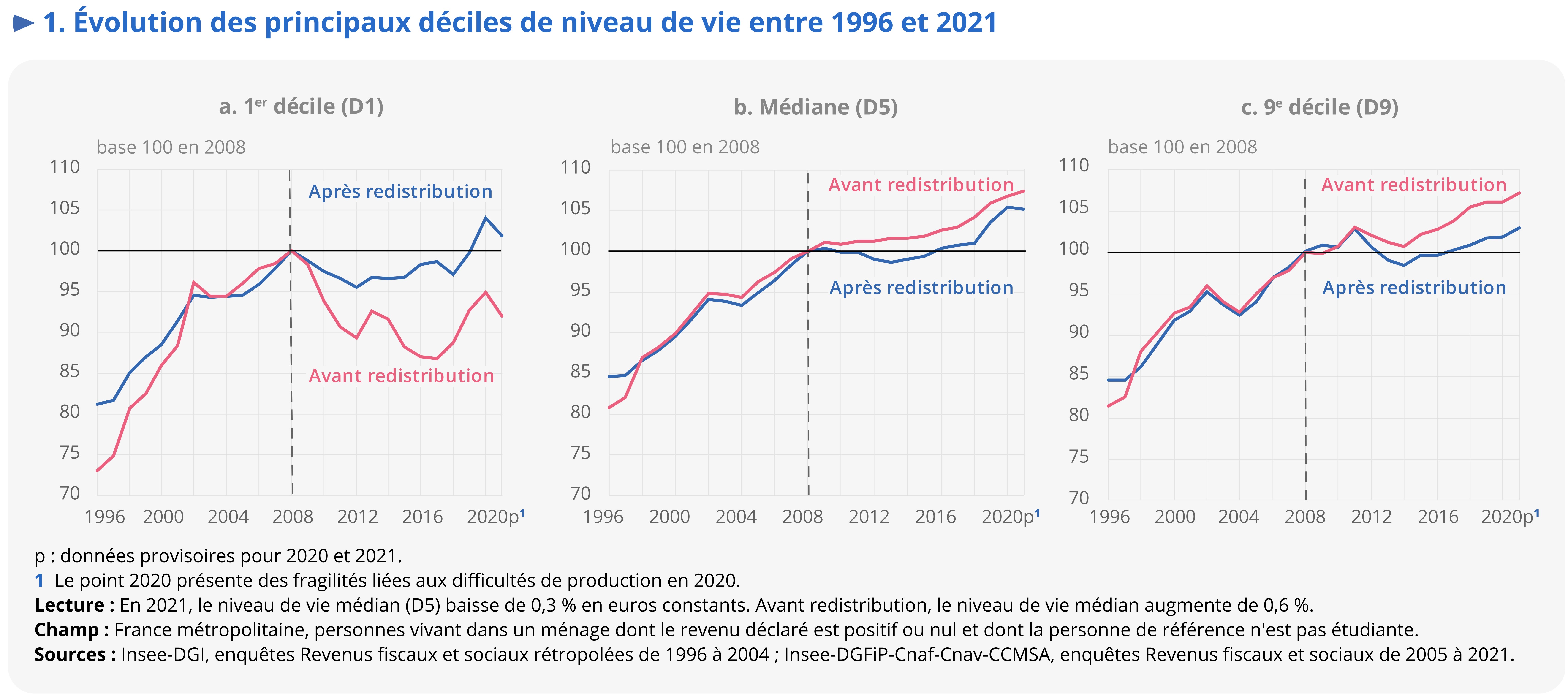 - Les niveaux de vie baissent pour la moitié des ménages les plus modestes à la suite de l’arrêt des aides exceptionnelles de solidarité Covid