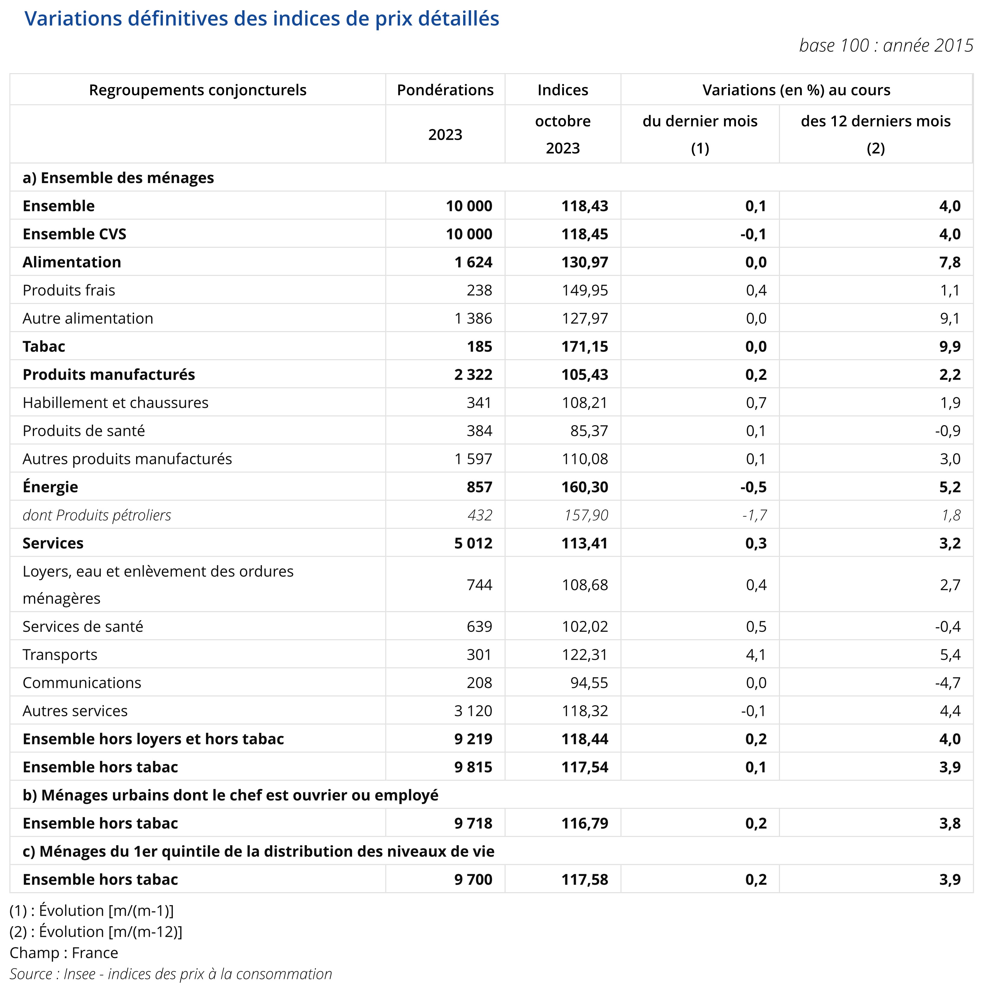 - Évolution mensuelle : +0,1 % en octobre ; variation sur un an : +4,0 %