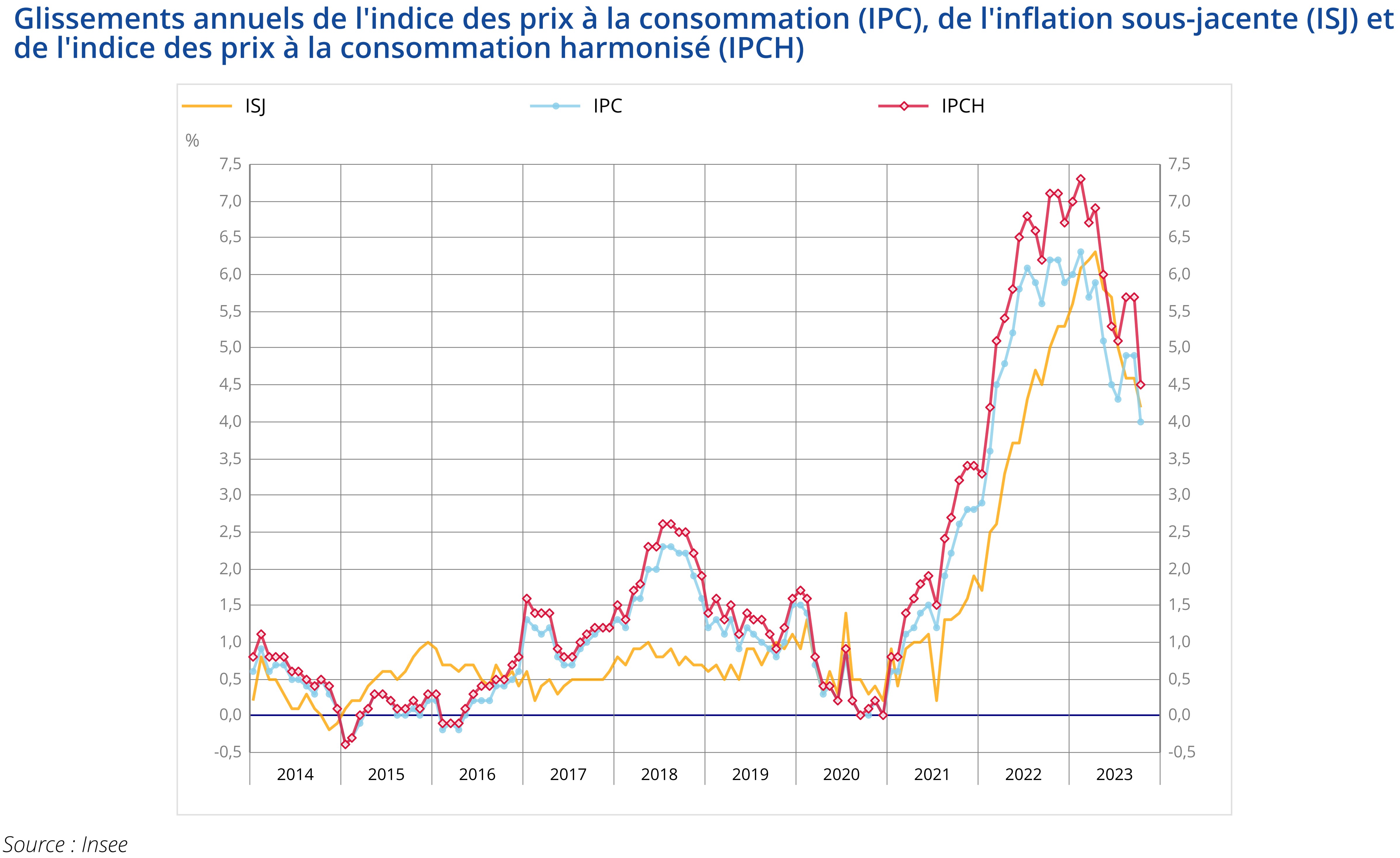 En octobre 2023, les prix à la consommation augmentent de 0,1 % sur un mois et de 4,0 % sur un an. Insee. Novembre 2023.