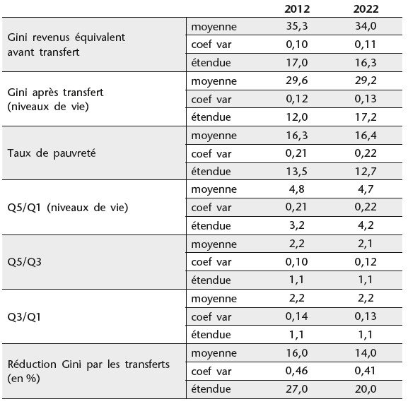 La première impression laissée par la lecture du tableau 1 est celle d'une stabilité relative des indicateurs entre 2012 et 2022, notamment dans le bas de l'échelle de revenus : le taux de pauvreté et le ratio interquintile (Q3/Q1) de niveaux de vie sont stables, à la fois en moyenne et en variance dans l'UE27. En moyenne, la (légère) baisse du Gini moyen de revenu équivalent avant transfert entre 2012 et 2022 est compensée par la (légère) baisse du pouvoir redistributif des transferts directs. Cette baisse moyenne est accompagnée par une (légère) baisse de la variance entre les pays de l'UE27.