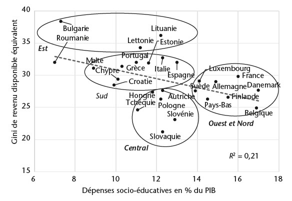 Ce simple retraitement permet de distinguer assez nettement des groupes géographiques, comme le montre le graphique 2, qui lie Gini de revenu disponible et dépenses socioéducatives. Le premier groupe mêle les pays dits d'Europe continentale (Allemagne, Belgique, France, Luxembourg, Pays-Bas) et les pays dits nordiques (Danemark, Suède, Finlande) : ces pays, que l'on peut appeler de l'Ouest et du Nord (O + N), combinent fortes dépenses et niveaux d'inégalités relativement faibles. Le deuxième groupe est constitué de pays d'Europe centrale (C) anciennement membres du bloc soviétique (Pologne, Hongrie, Slovaquie, Slovénie, République tchèque), plus l'Autriche. Ces pays, qui partagent la même centralité géographique, ont des niveaux d'inégalités très faibles (c'est le groupe aux plus faibles inégalités), bien que les dépenses socioéducatives n'y soient pas si élevées. Il y a plus d'hétérogénéité dans les pays restants. Un groupe inclut les pays du Sud (S), soit Espagne, Italie, Portugal, Grèce, Malte, Chypre, et Croatie. Si les inégalités de niveaux de vie dans ces pays sont proches, ils diffèrent (un peu plus) par les dépenses sociales-éducatives. Le dernier groupe de pays excentrés vers l'Est (E), anciennement de l'ancien bloc communiste, inclut deux sous-groupes géographiques : Bulgarie et Roumanie d'une part, et pays baltes (Lituanie, Lettonie, Estonie) d'autre part. On peut noter que, s'il existe une corrélation internationale entre inégalités et dépenses sociales-éducatives visible sur le graphique 2, les groupes de pays, eux, ne sont pas vraiment ordonnés de ce point de vue, contrairement à la classification classique d'Esping-Andersen dans laquelle les pays « sociaux-démocrates » avaient à la fois les plus fortes dépenses sociales, la plus forte « décommodification » et les inégalités les plus faibles. Par exemple, si le sous-groupe des pays baltes, celui de l'Europe du Sud et celui de l'Europe centrale ont en moyenne des dépenses sociales-éducatives équivalentes, ils ne partagent pas le même niveau d'inégalités. À l'inverse, les inégalités sont les plus faibles dans le groupe d'Europe centrale alors que ce n'est pas le groupe ayant les dépenses sociales-éducatives les plus élevées.