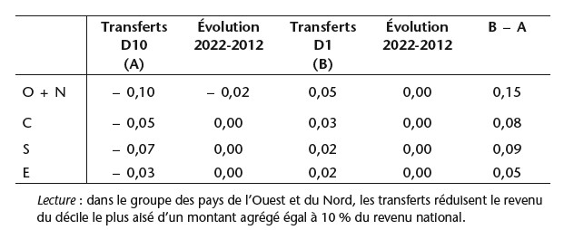 Tableau 2. Transferts nets pour le premier et le dernier décile en proportion du revenu national, évolutions entre 2012 et 2022 et écarts de transferts selon le groupe géographique