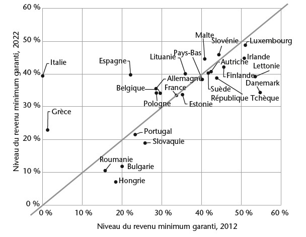 La MOC sociale insiste sur l'objectif de lutte contre la pauvreté et contre l'exclusion, et de droits économiques des plus pauvres. Cela plaide pour faire un focus sur les politiques concrètes mises en place dans l'UE27 et, notamment, sur les revenus minimums garantis et leurs niveaux respectifs. Avec l'aide du modèle Taxben de l'Organisation de coopération et de développement économiques (OCDE), nous comparons les niveaux des minimums dans vingt-cinq des vingt-sept pays de l'UE (les données sont manquantes à Chypre et en Croatie pour 2012) en additionnant le niveau de revenu d'assistance et celui des allocations logement, pour deux configurations de ménages sans revenus (célibataire sans enfant, couple avec deux enfants), exprimé en pourcentage du salaire moyen national. Le graphique 3 montre des évolutions contrastées. D'une part, des systèmes de revenus minimums garantis ont été introduits en Italie et en Grèce. Mais, d'autre part, ceux-ci ont été affaiblis dans un certain nombre de pays de l'Est et du Centre (Roumanie, Hongrie, Danemark). En moyenne dans les vingt-cinq pays, assez marginalement, mais elle augmente fortement dans les pays du Sud observés. Toutefois, si la part du revenu disponible perçu par le décile le moins aisé augmente beaucoup en Grèce entre 2012 et 2022 (de 1,8 % à 2,6 %), c'est moins le cas en Italie (de 2,3 % à 2,5 %), ce qui est probablement dû à des variations entre l'affichage institutionnel et la réalité en termes de revenus des ménages. Il n'y avait pas rien avant l'institution du revenu de citoyenneté en 2017 en Italie ou en Grèce (l'assistance sociale était gérée au niveau local) et, depuis, le recours n'est pas complet non plus. Il faut donc utiliser les comparaisons internationales par cas-types, avec précaution — par exemple comme ici en complétant l'analyse avec des enquêtes s'appuyant sur des revenus réels.