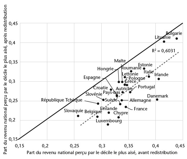 Graphique 4. Part du décile le plus aisé dans le revenu national avant et après redistribution au sein de l'UE27