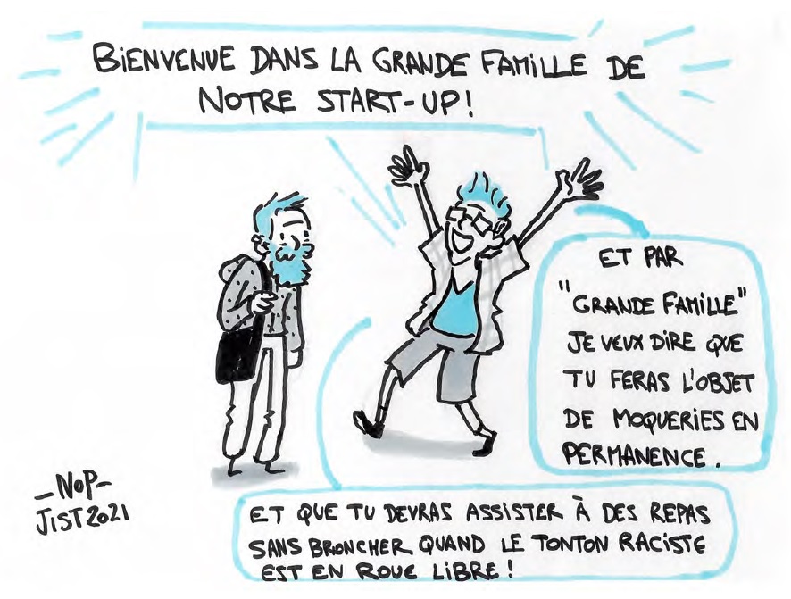 Créées par de jeunes cadres qui cherchent à prendre le contre‑pied de la grande entreprise, les start-up se caractérisent par un modèle d'organisation qui se veut horizontal et fraternel, dans lequel fondateur·trices et salarié·es formeraient une « grande famille ». Certaines personnes parlent alors, pour qualifier les modes de management, l'ambiance et les relations de travail dans les start‑up, d'un « esprit start‑up ».