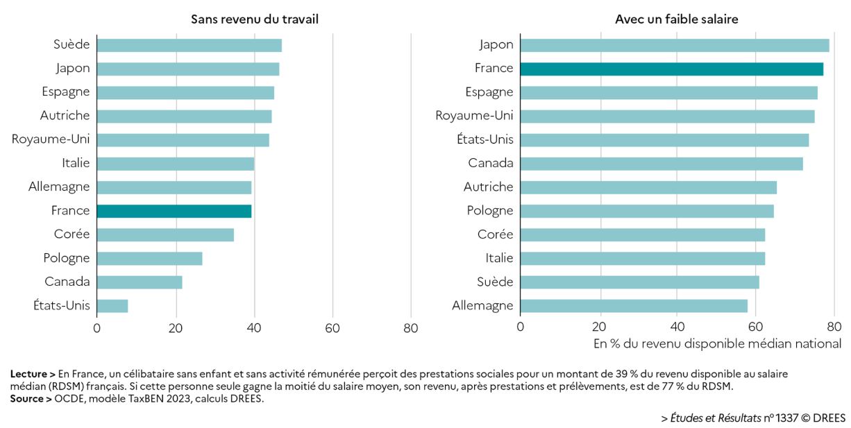 Le système socio-fiscal français soutient les personnes sans ressources et, plus que dans d’autres pays, les travailleurs modestes. DREES. Avril 2024.