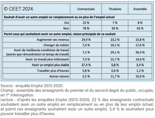 Part d'enseignants souhaitant avoir un autre emploi et raison motivant ce souhait en fonction du statut (% en colonnes, effectifs pondérés)
