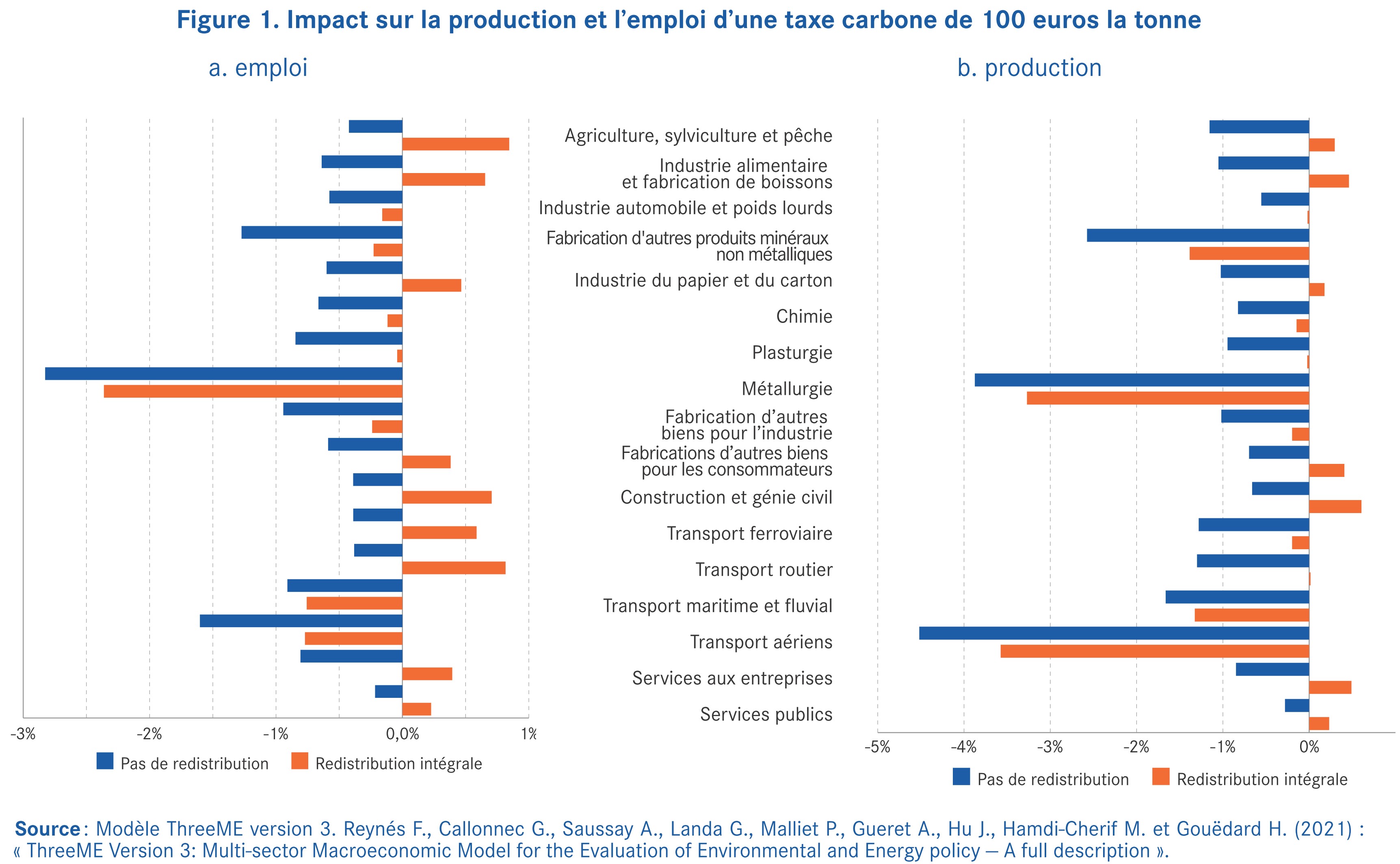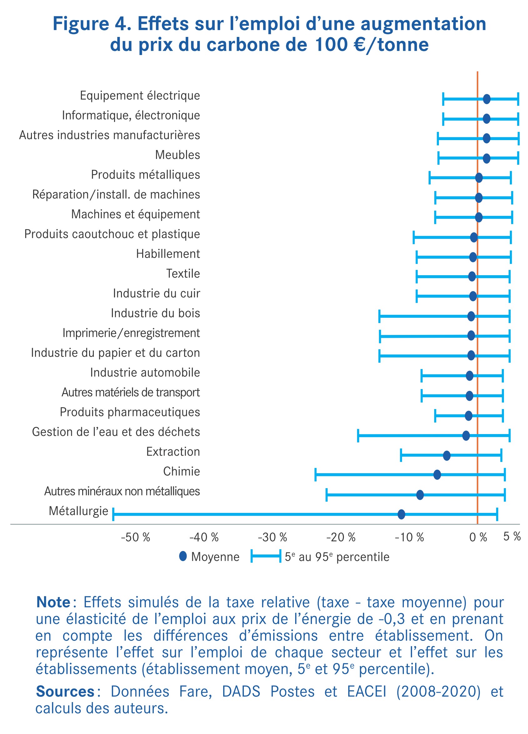 Au niveau macroéconomique, cette taxe aura des répercussions limitées sur l'emploi en France : d'abord car les entreprises adapteront sans doute leur mix énergétique en conséquence ; ensuite car cette tarification du carbone sera très probablement adoptée au niveau européen, parallèlement à un mécanisme d'ajustement carbone aux frontières. Il faut également tenir compte de la diversité des technologies et des mix énergétiques au sein de chaque secteur car la forte hétérogénéité entre entreprises implique de nombreuses réallocations de l'emploi au sein d'un même secteur, plus importantes que les réallocations entre secteurs : la somme des destructions et créations d'emplois intrasectorielles représenterait en effet 4 % de l’emploi total.