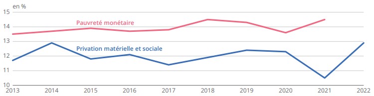 Sources : Insee, enquêtes Statistiques sur les ressources et les conditions de vie (SRCV) de 2013 à 2022 pour la privation matérielle et sociale ; Insee‑DGFiP‑Cnaf‑Cnav-CCMSA, enquêtes Revenus fiscaux et sociaux 2013 à 2021 pour la pauvreté monétaire. Revenus et Patrimoine des Ménages, Insee Références (2024).