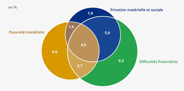 Figure 3 : Part de la population concernée par la pauvreté monétaire, la privation et les difficultés financières en 2023.