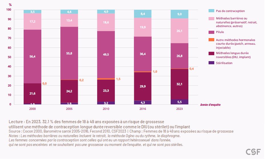 Qu'il s'agisse d'insister pour utiliser un préservatif ou d'éviter d'en apporter soi-même, des représentations socialement différenciées de la sexualité sont au cœur des négociations autour du préservatif. Mais passé le « sas » que représente son utilisation, c'est une contraception médicalisée qui prévaut en France : la pilule pour les plus jeunes, puis le stérilet après avoir eu les enfants désirés. Cette norme contraceptive française (préservatif – pilule – stérilet) a cependant évolué au cours des quinze dernières années, l'usage de la pilule étant notamment divisé par deux, majoritairement au profit du stérilet, et ce même chez les femmes n'ayant jamais eu d'enfant. L'enquête Contexte des sexualités en France 2023 (CSF) [5], dont les premiers résultats ont été dévoilés en novembre 2024, donne à voir cette évolution :
