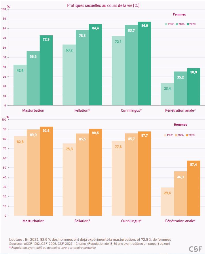 Mais si ce travail sur la sexualité est indispensable de la part des femmes, c'est notamment parce la sexualité reste très associée à la pénétration péno-vaginale. Or, la diffusion de la contraception et le discours normatif qui l'entoure ont contribué à entériner la place centrale de cette dernière, la sexualité hétérosexuelle ne semblant pouvoir s'envisager sans contraception, et ce alors même que le répertoire sexuel s'élargissait largement depuis soixante ans, ainsi qu'en témoigne l'enquête Contexte des sexualités en France 2023, qui propose une comparaison des trente dernières années :